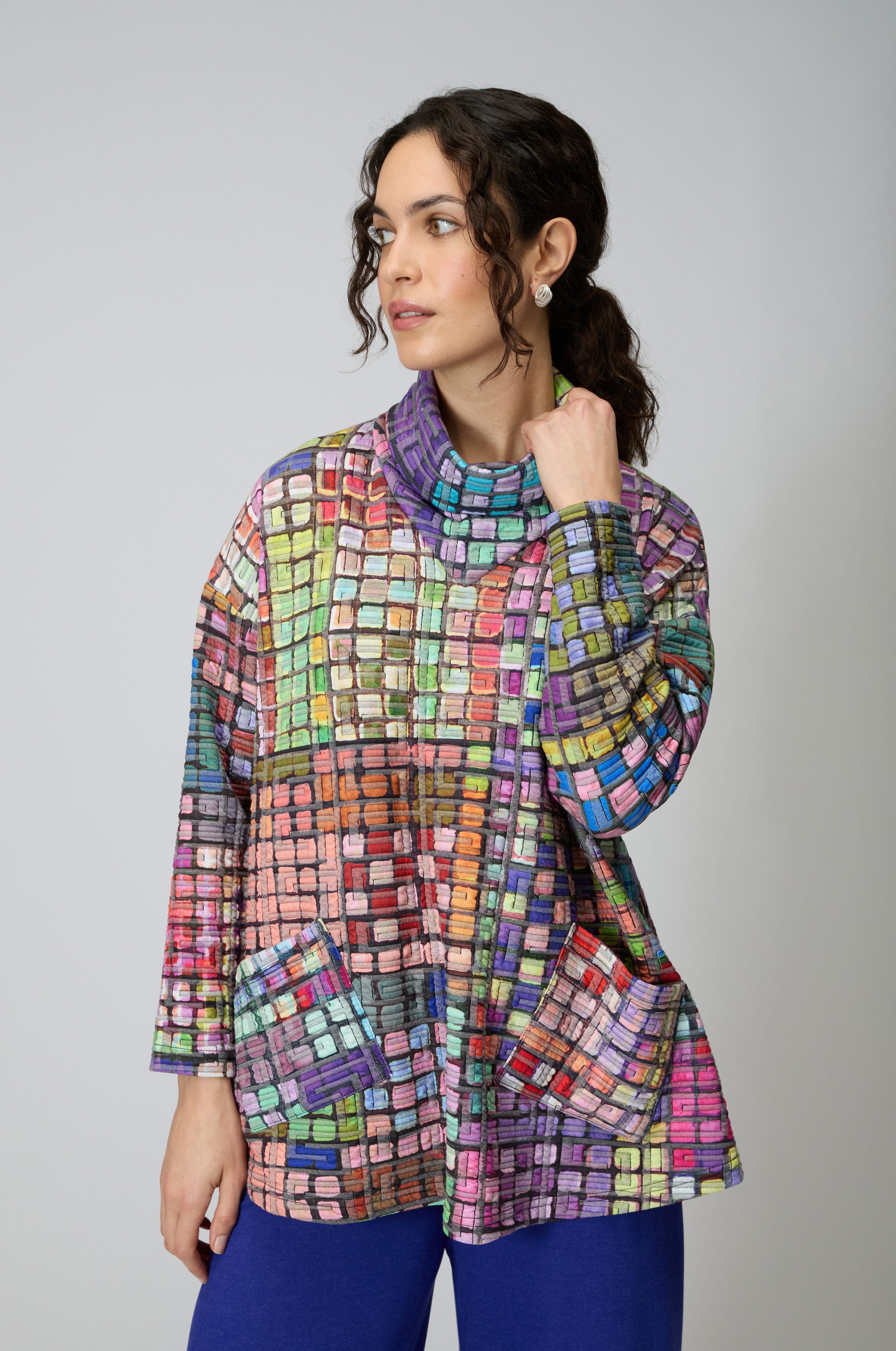 The Coloured Glass Tiles Jersey Tunic offers a relaxed shape with gentle structure, making it an easy statement piece for everyday wear. Colour and print bring depth while the silhouette remains comfortable and unfussy.