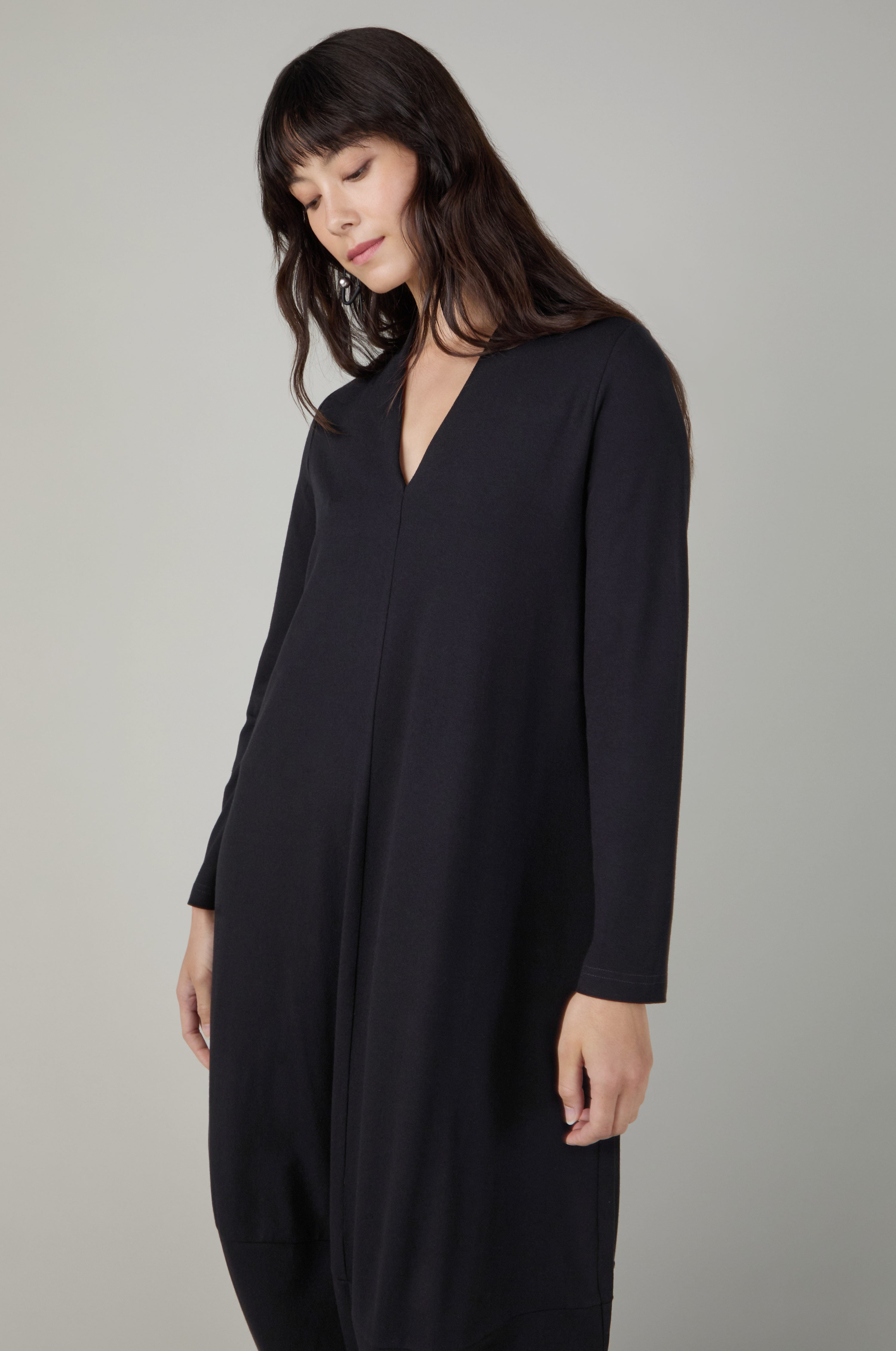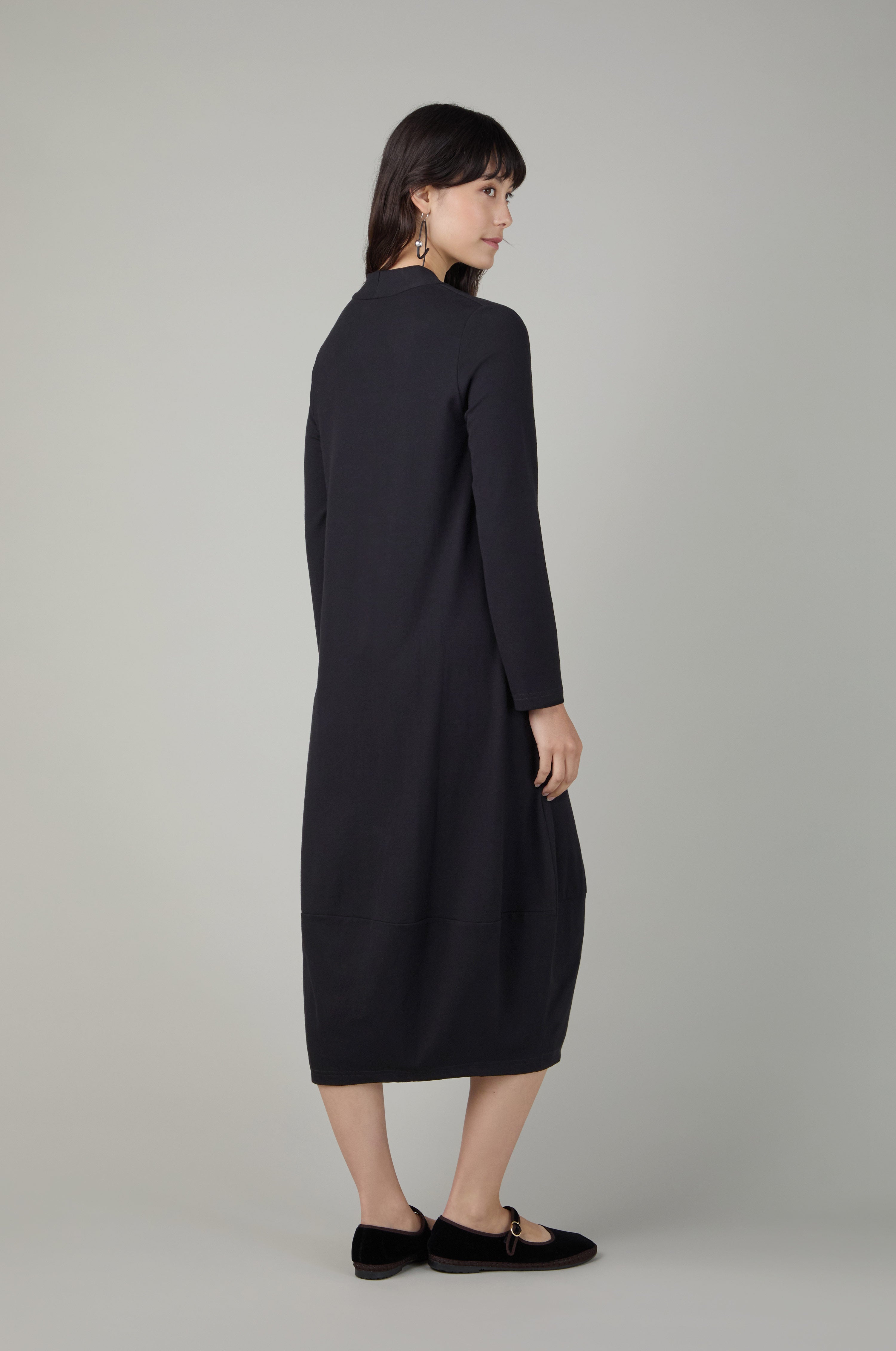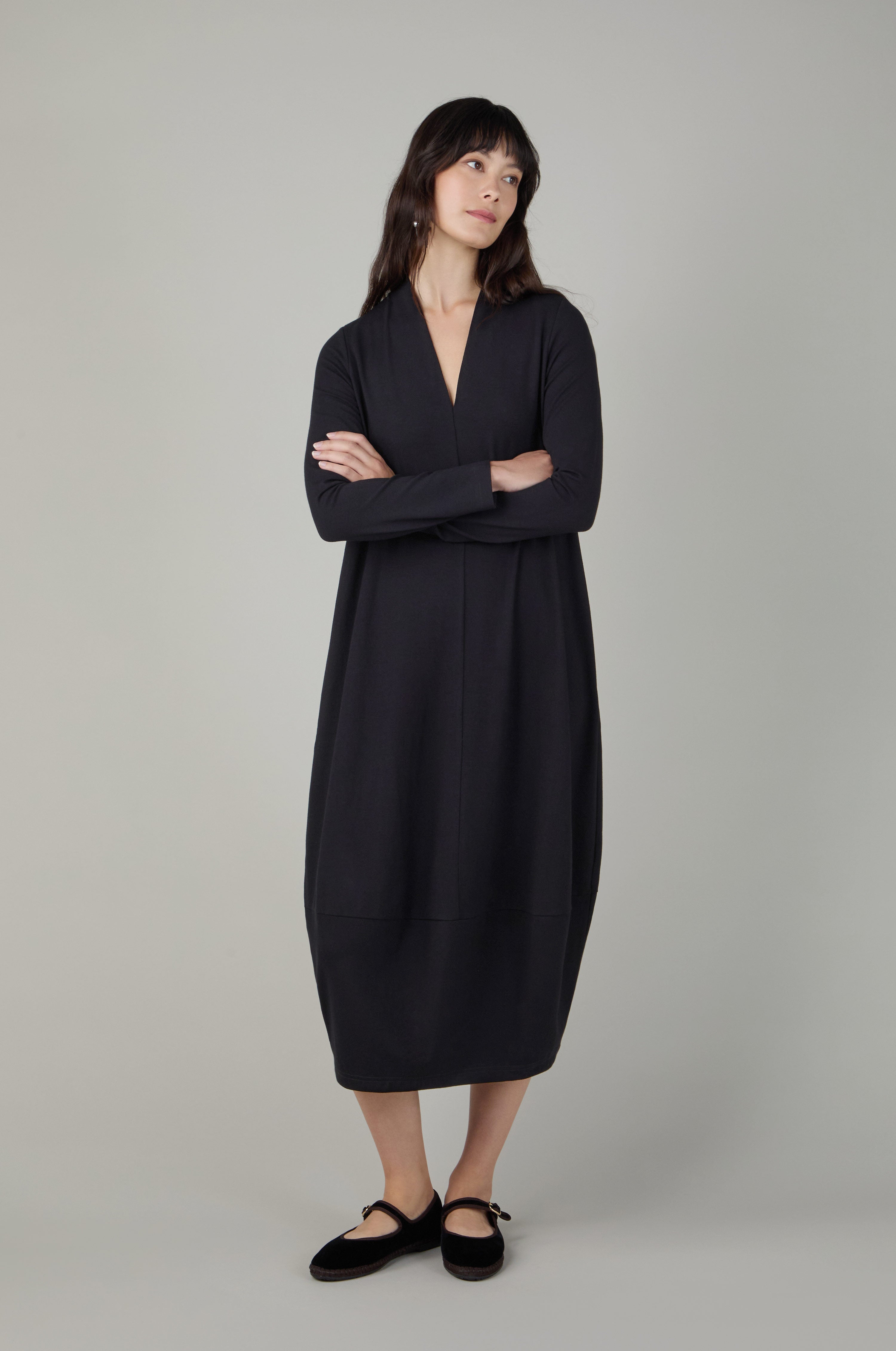Designed to transition seamlessly from day to evening, this sculptural dress is cut from a soft crepe jersey with a fluid drape and lightly textured finish. The bubble silhouette adds gentle volume through the skirt, balanced by a flattering V-neckline and full-length sleeves. Subtle seaming shapes the form without clinging, while the midi length makes it a versatile choice across seasons.