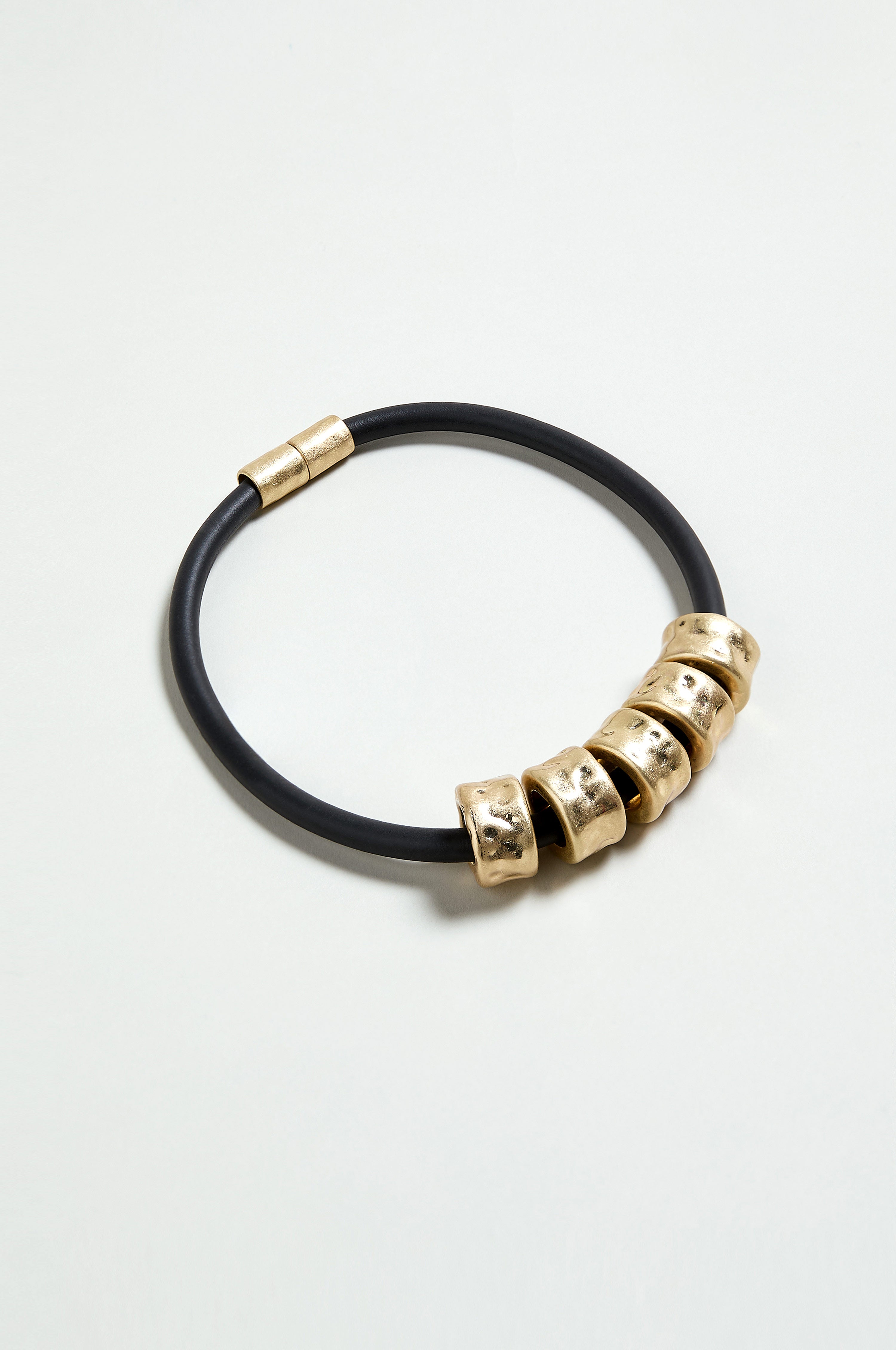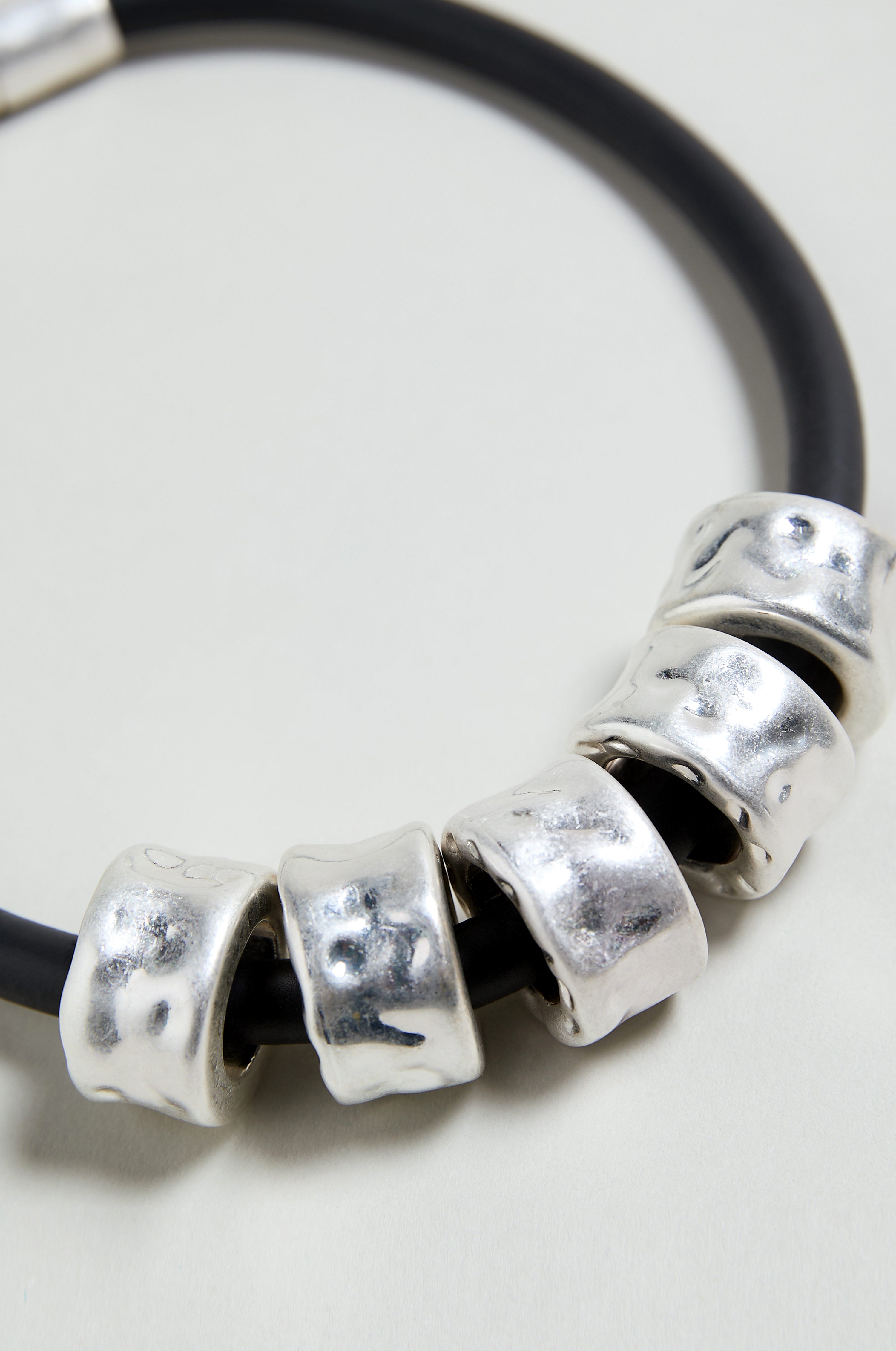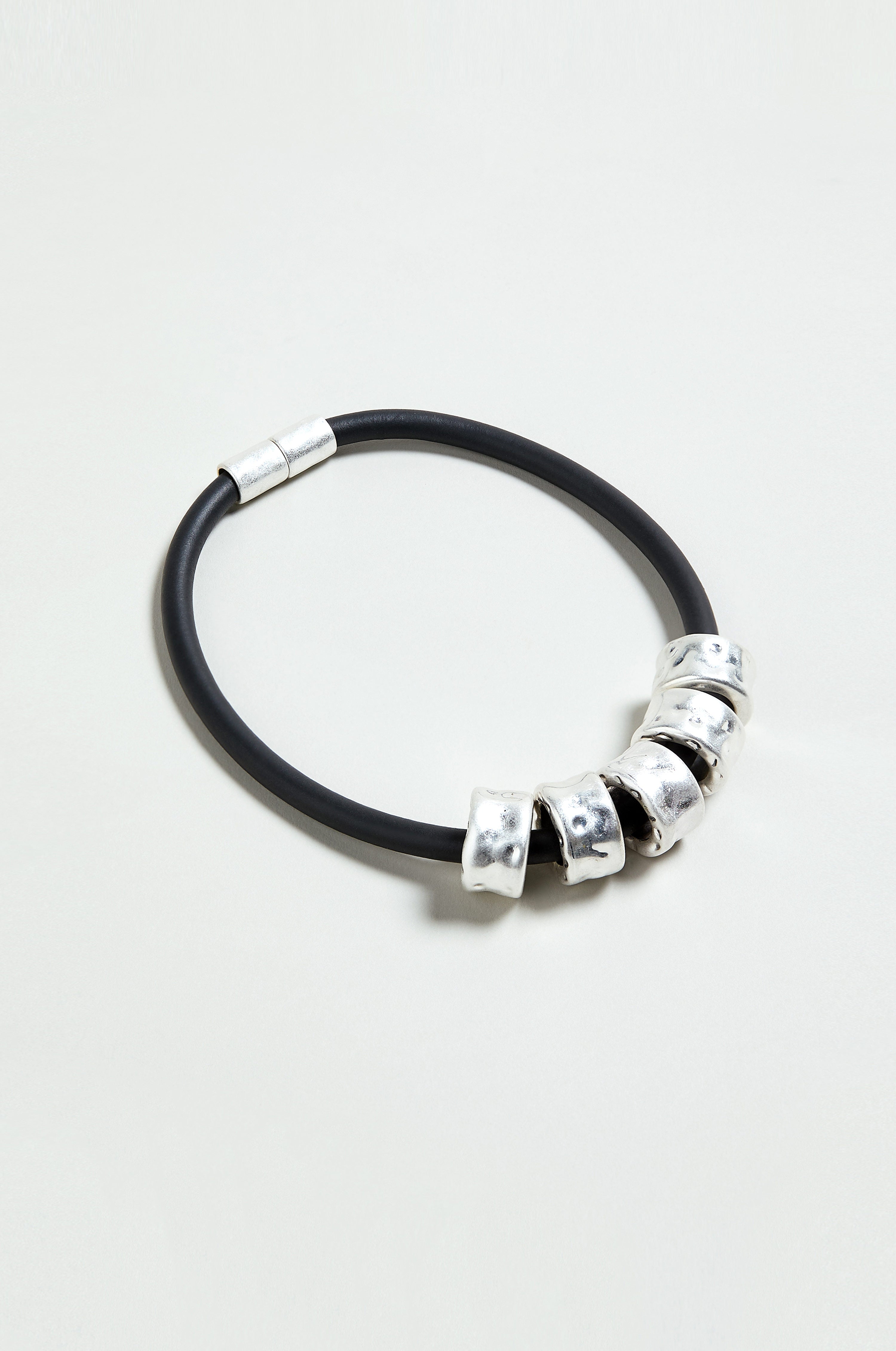The Hammered Cylinders Necklace is a striking study in contrast and restraint. A smooth black rubber cord forms a clean, contemporary base, punctuated by softly hammered cylindrical beads in zamak metal. The textured finish catches the light with subtle irregularity, creating visual interest without excess. Designed to sit neatly at the neckline, this modern necklace brings a sculptural edge to simple dresses, knitwear, and layered looks.