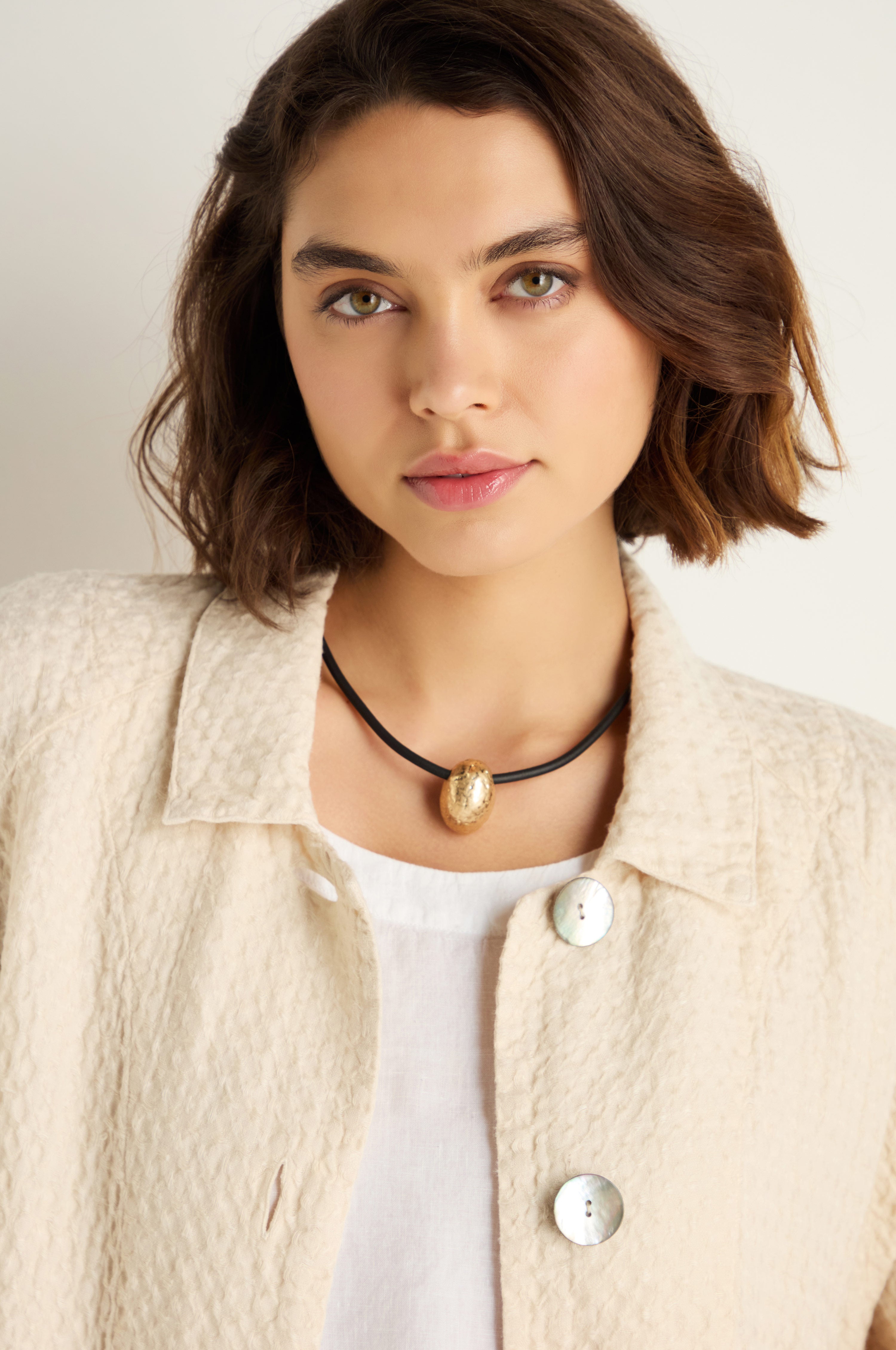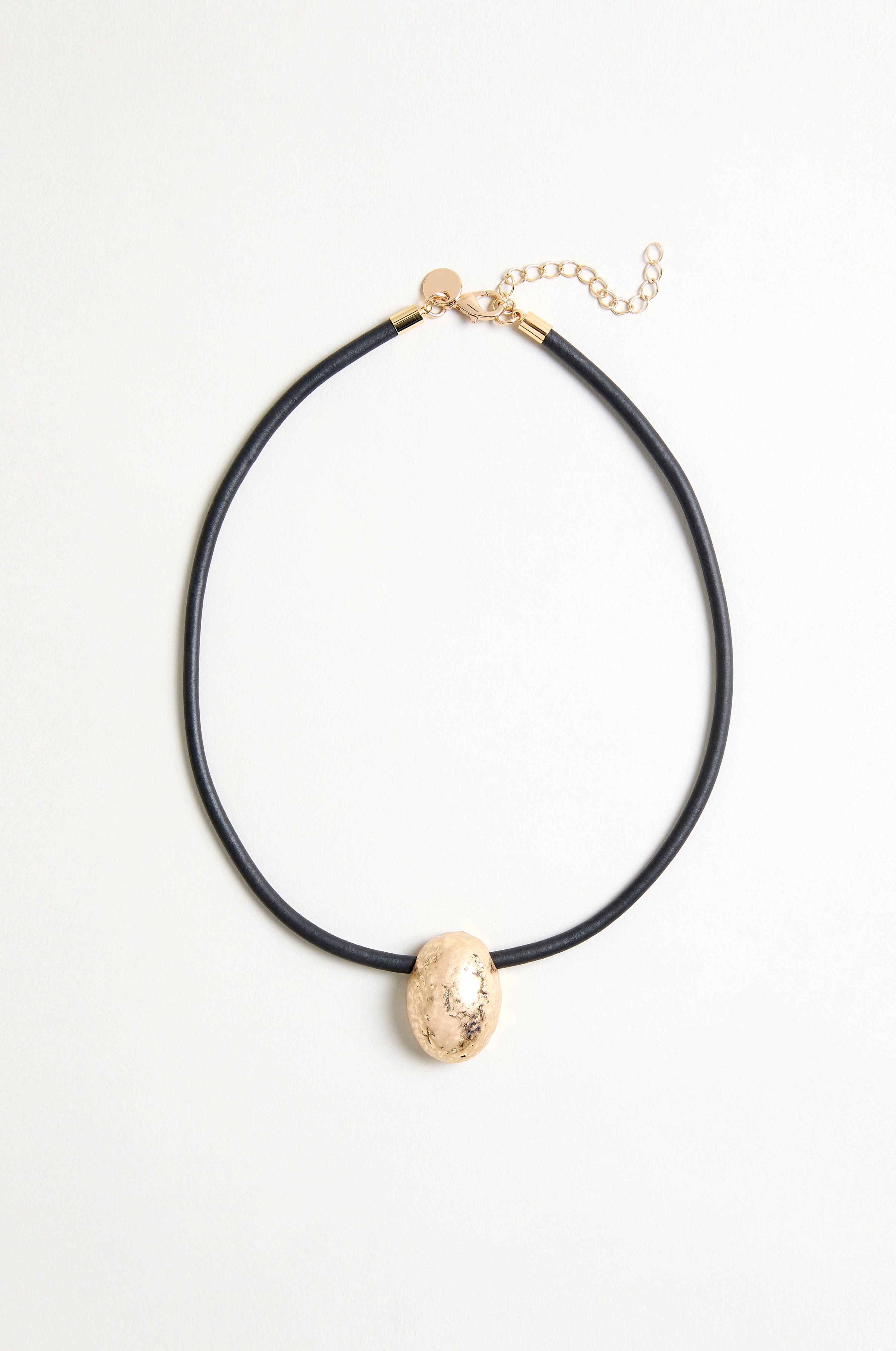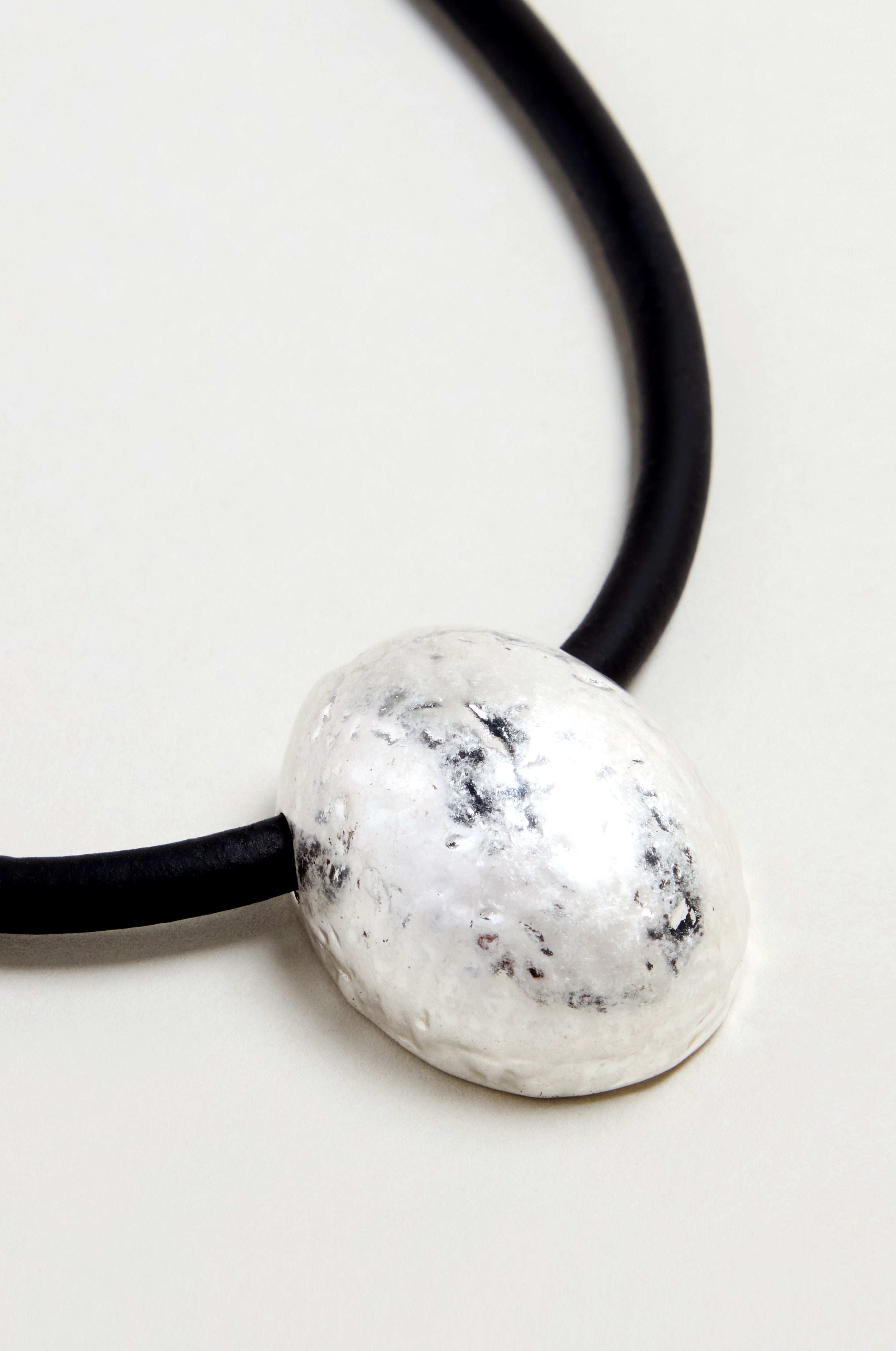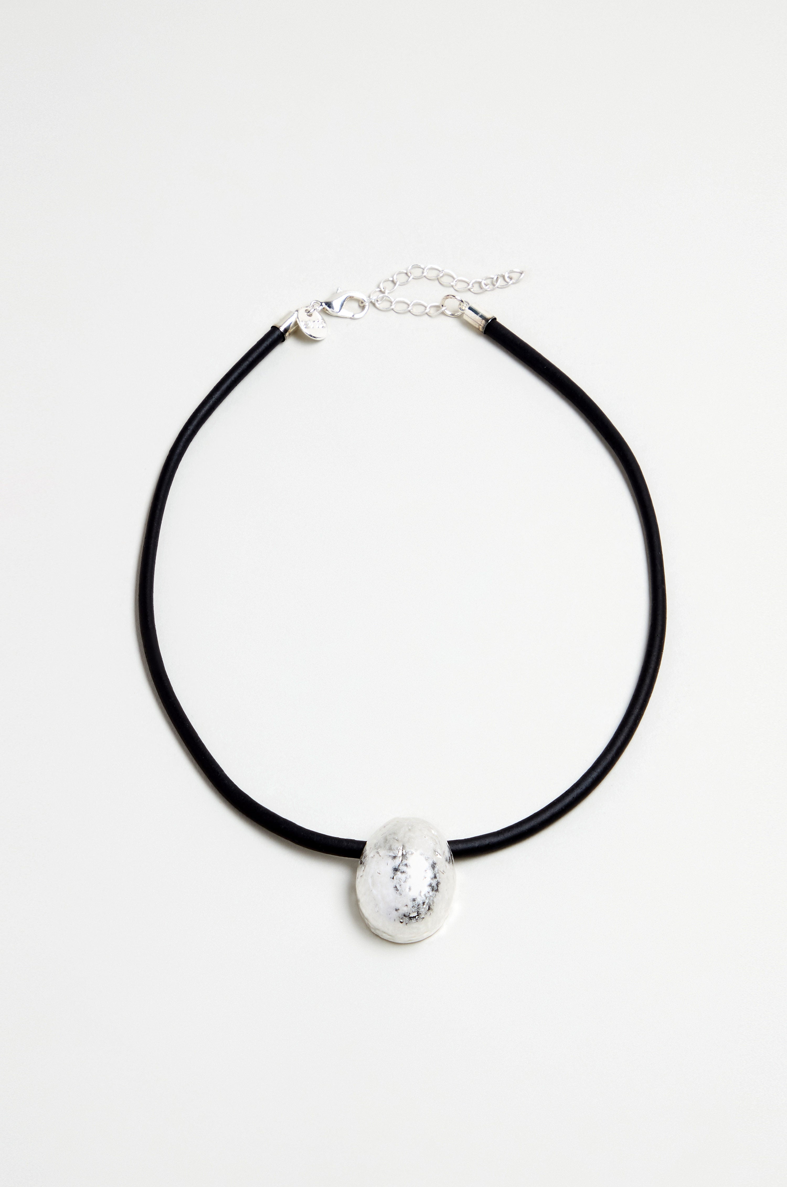 The Sahara Hammered Pebble Necklace is a refined, sophisticated statement piece. A softly hammered pebble sits at the centre, offering subtle texture and light catch without overpowering the look. Finished on a smooth rubber cord, it brings modern contrast and everyday ease.