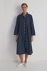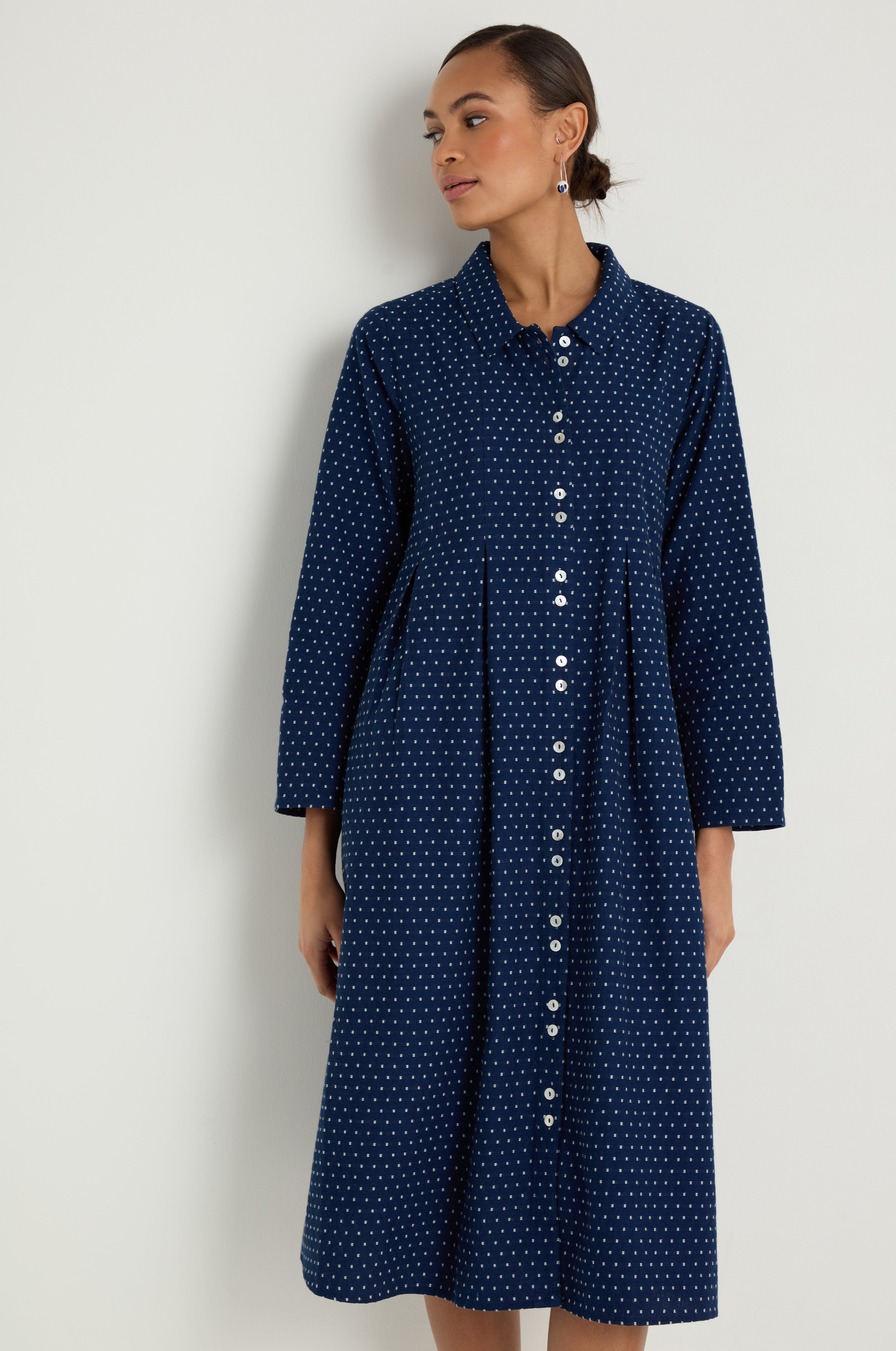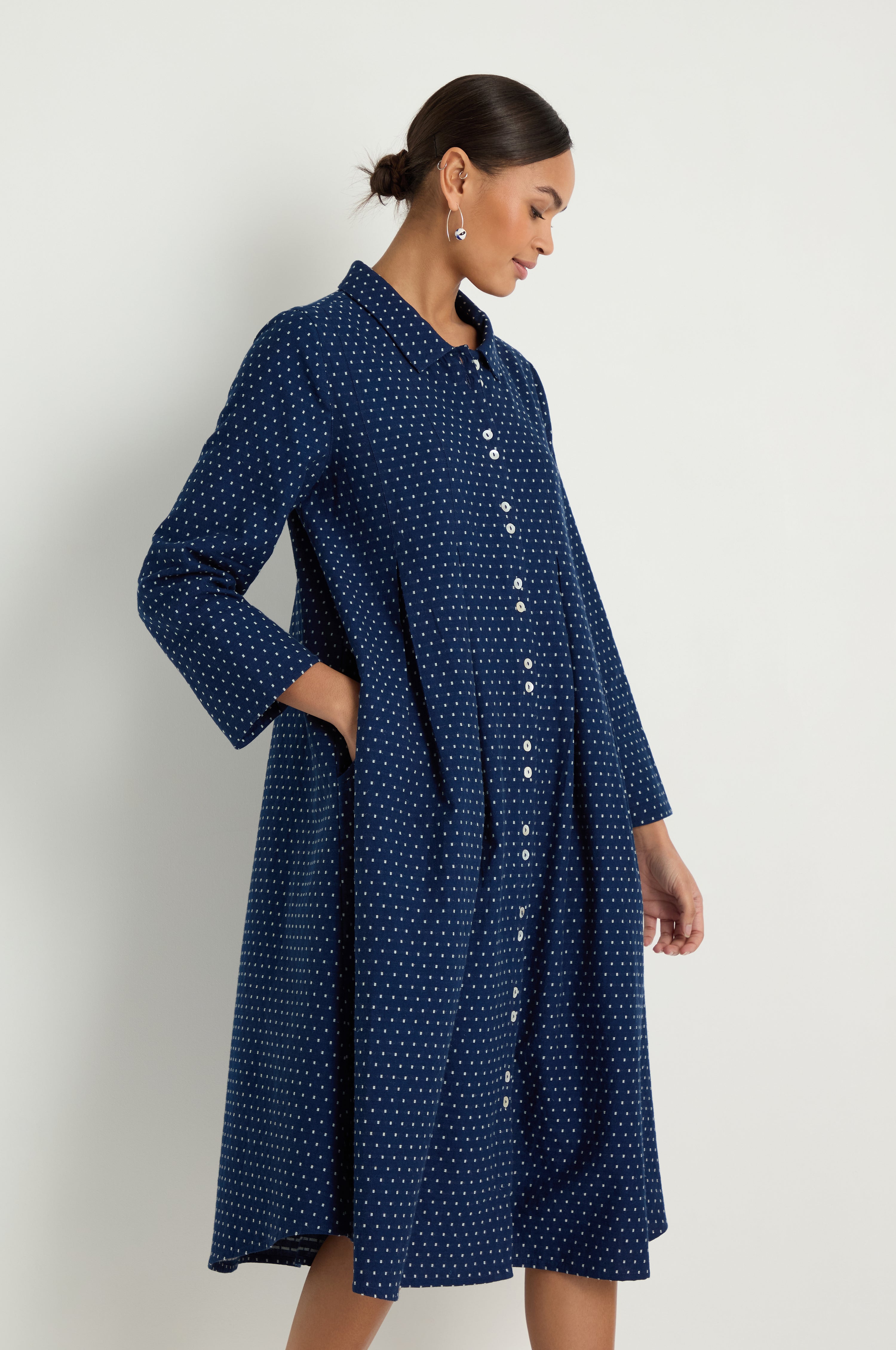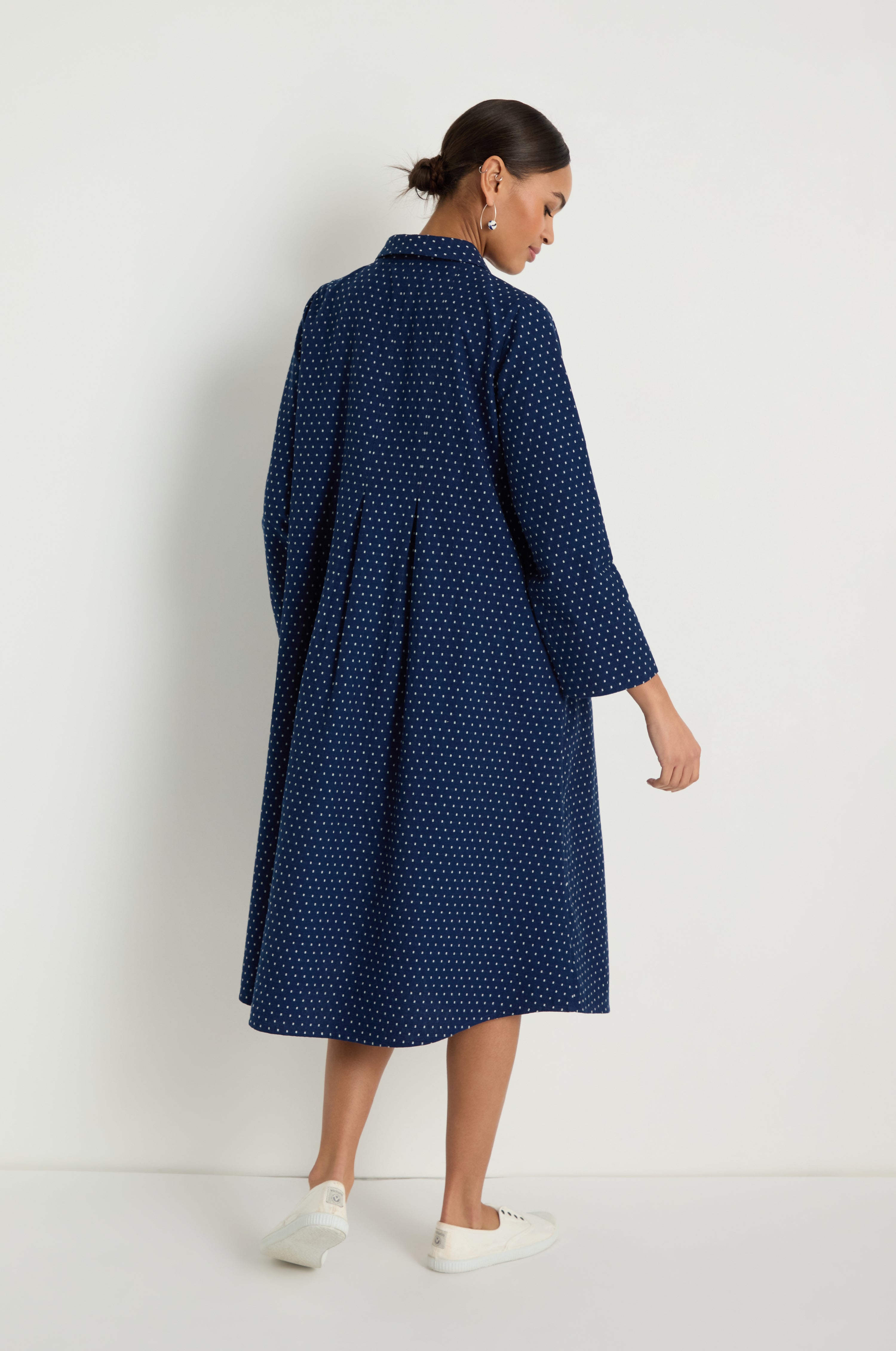 The Sahara Indigo Spot Cotton Shirt Dress is crafted from yarn-dyed cotton with a woven spot motif and an easy A-line shape that moves with the body. A relaxed yet refined shirt dress, it balances structure with comfort through thoughtful pleating and full coverage sleeves.