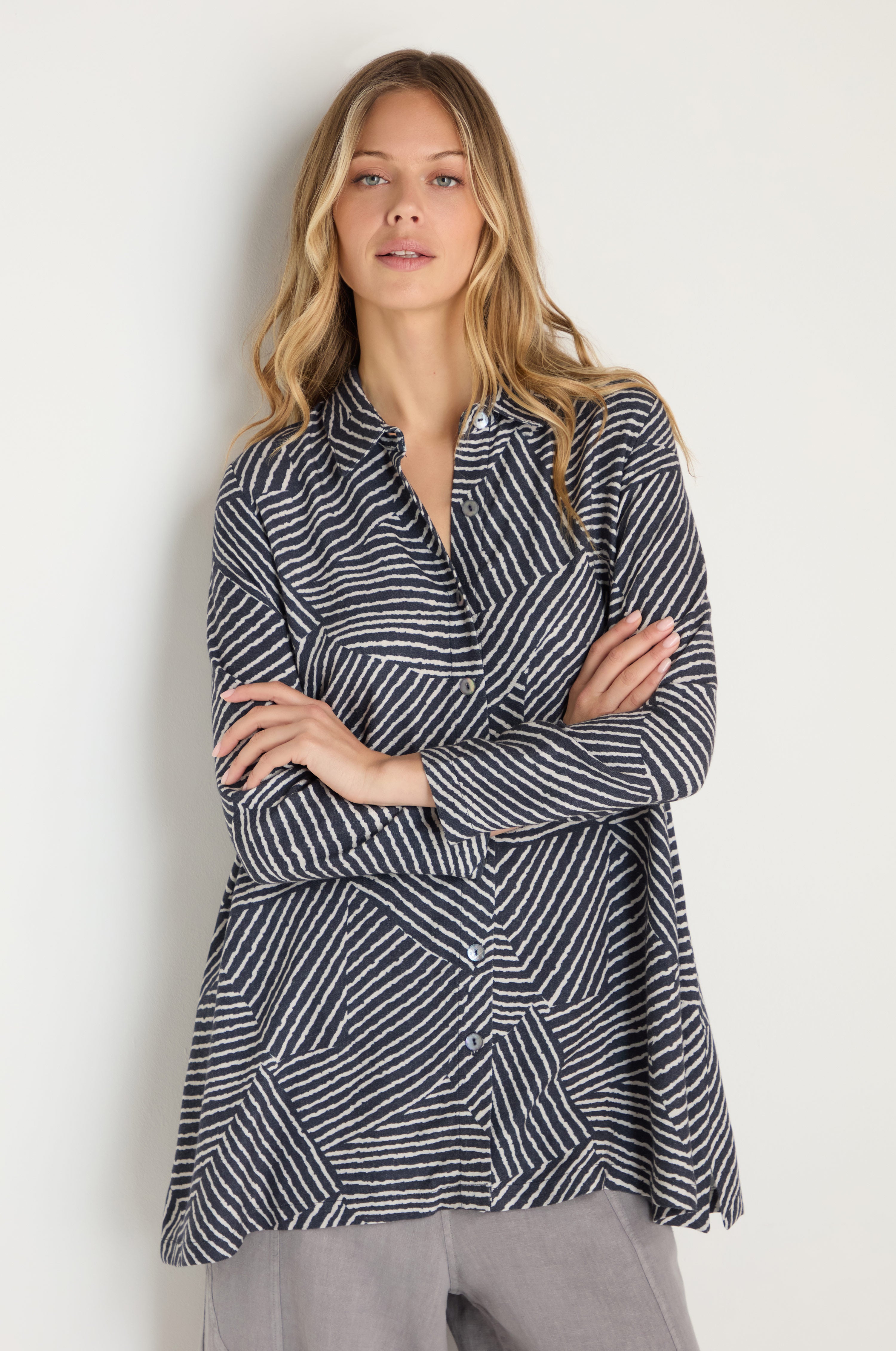The Sahara Linear Prism shirt is crafted in soft viscose flannel with a flatteringly versatile, swingy shape. The bold geometric print drapes beautifully, creating a modern, relaxed A-line silhouette with subtle ease and refinement.