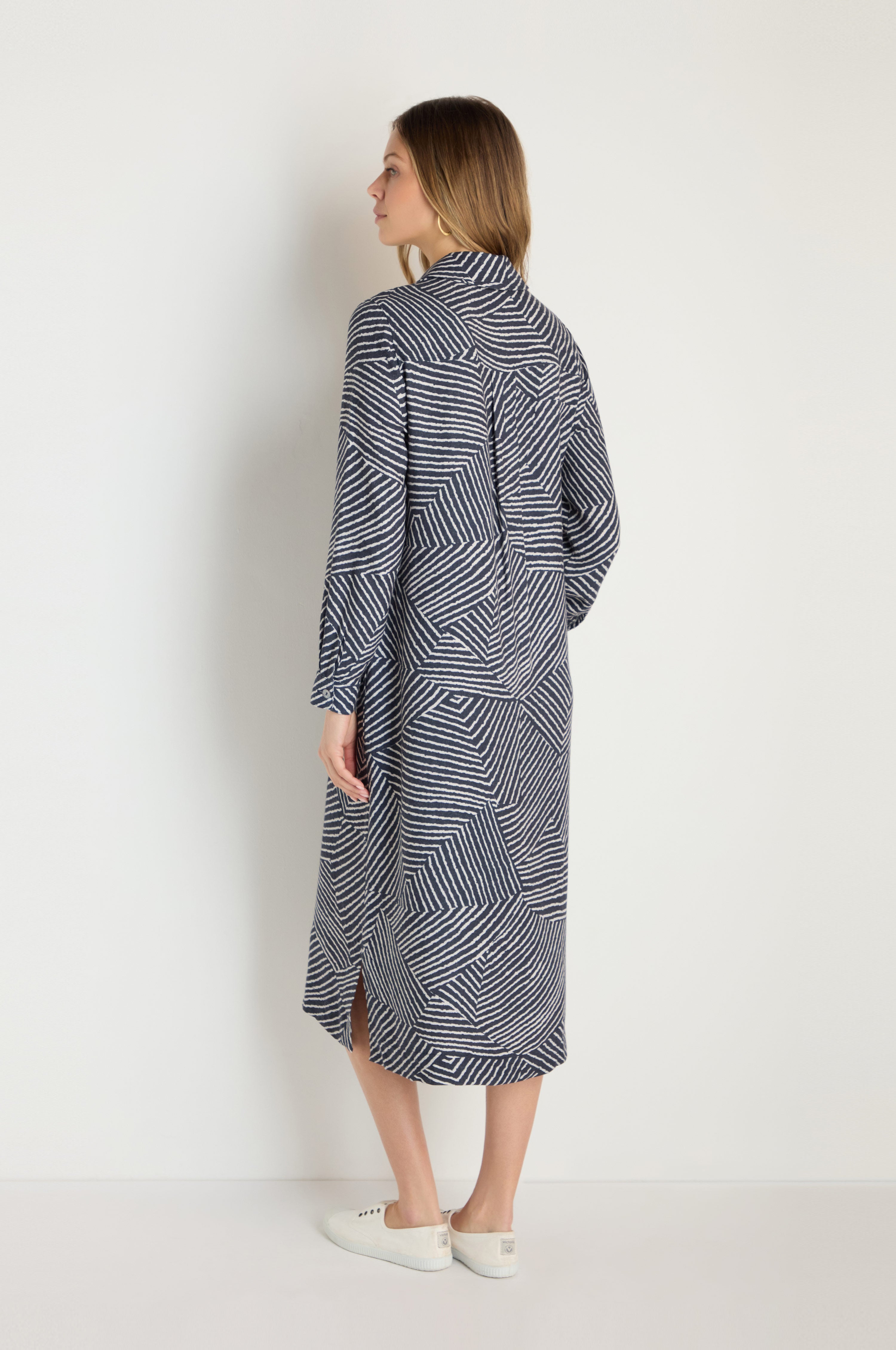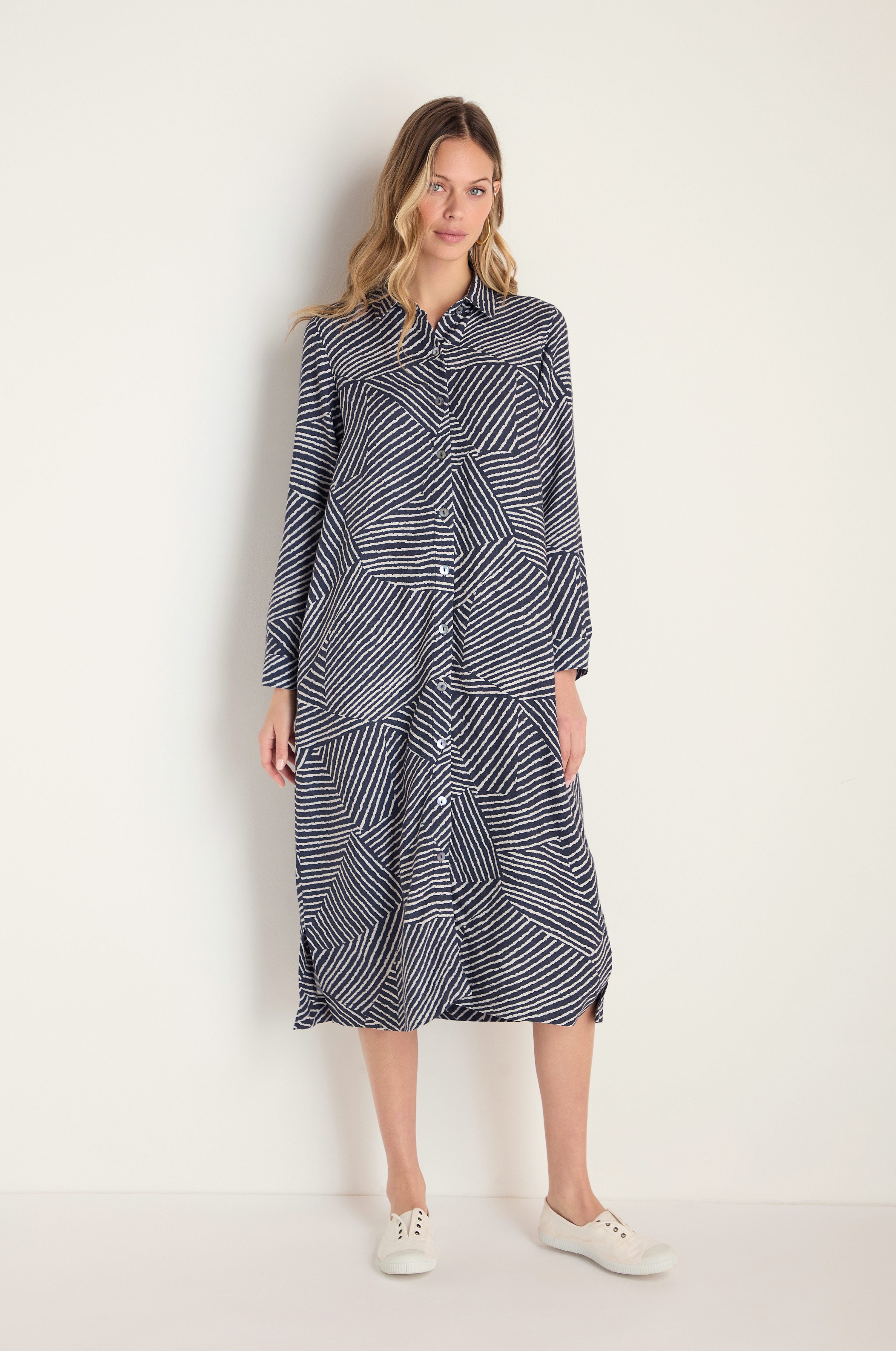 Effortlessly elegant, the Sahara Linear Prism shirt dress is defined by its striking geometric print and fluid, elongated silhouette. Crafted from warm, brushed viscose and detailed with distinctive smoked shell buttons, it moves gracefully with the body, balancing structure and ease for a look that feels modern, considered, and effortlessly refined.