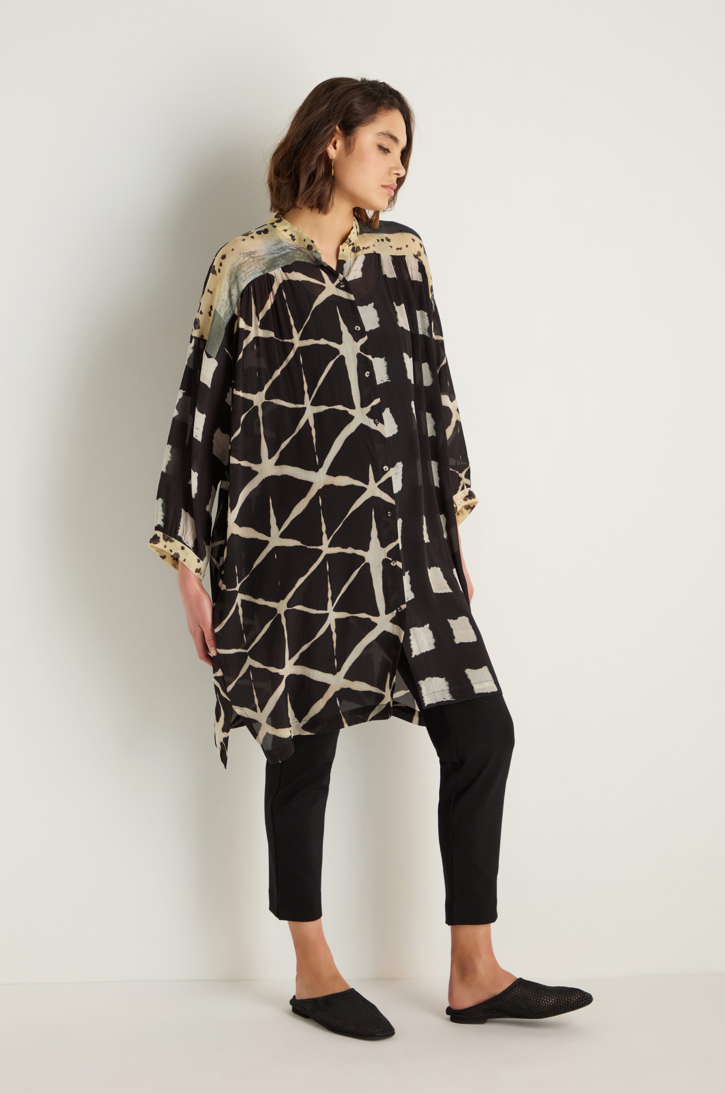 The Raga Shibori Print Long Shirt brings fluid movement and graphic contrast through a softly draped silhouette and expressive monochrome print. Cut long with effortless volume, it layers easily over trousers or can be worn open and closed as a statement piece, balancing ease with artful impact.