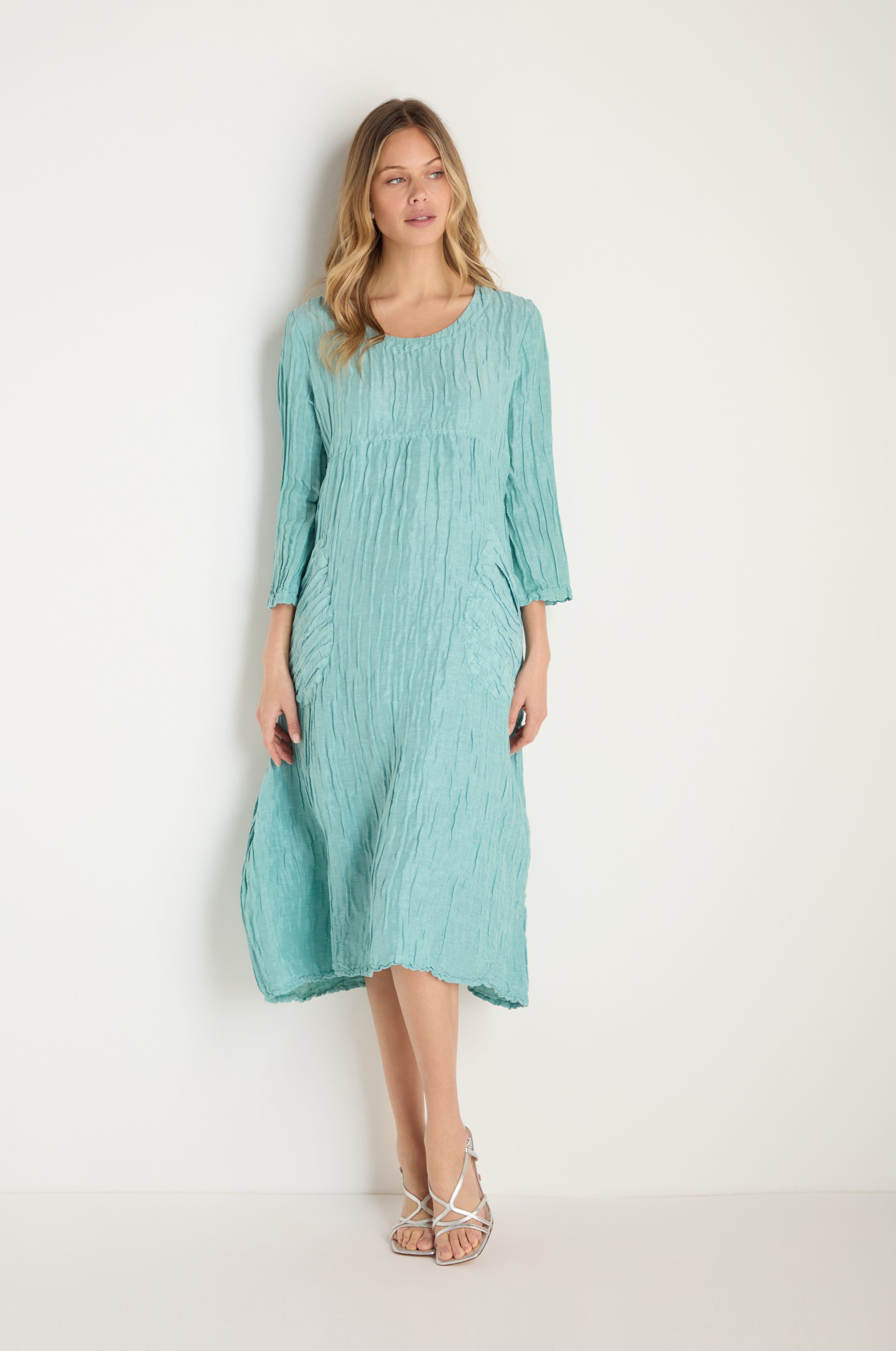 Embrace effortless elegance in this Silk Linen Mint Patch Pocket Dress by Grizas. Crafted from premium, breathable linen in a warm mint hue, it features artful ruched detailing that adds subtle dimension. The natural texture lends an organic, lived-in feel, creating a timeless silhouette with a modern, conscious edge.