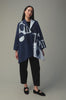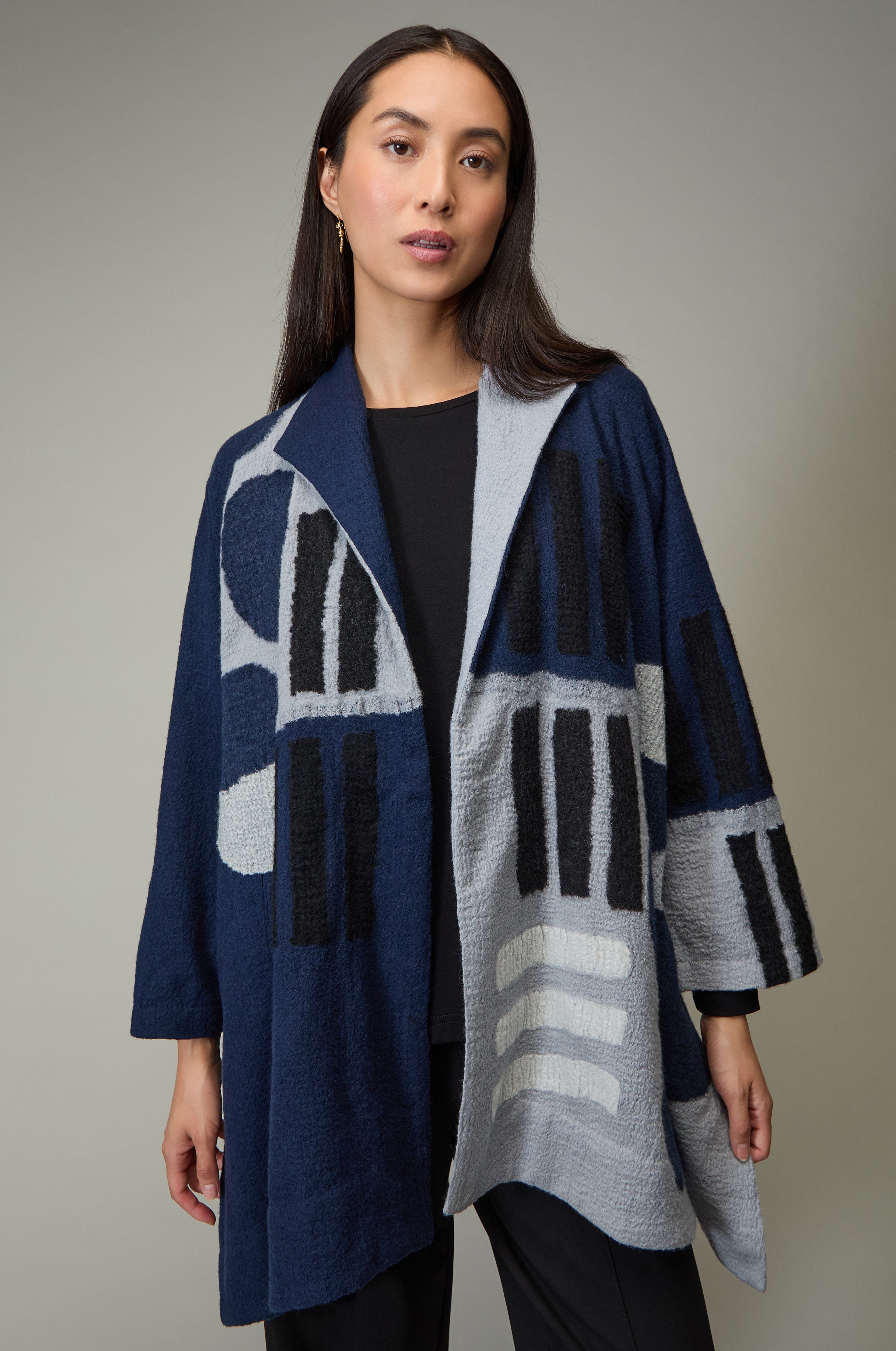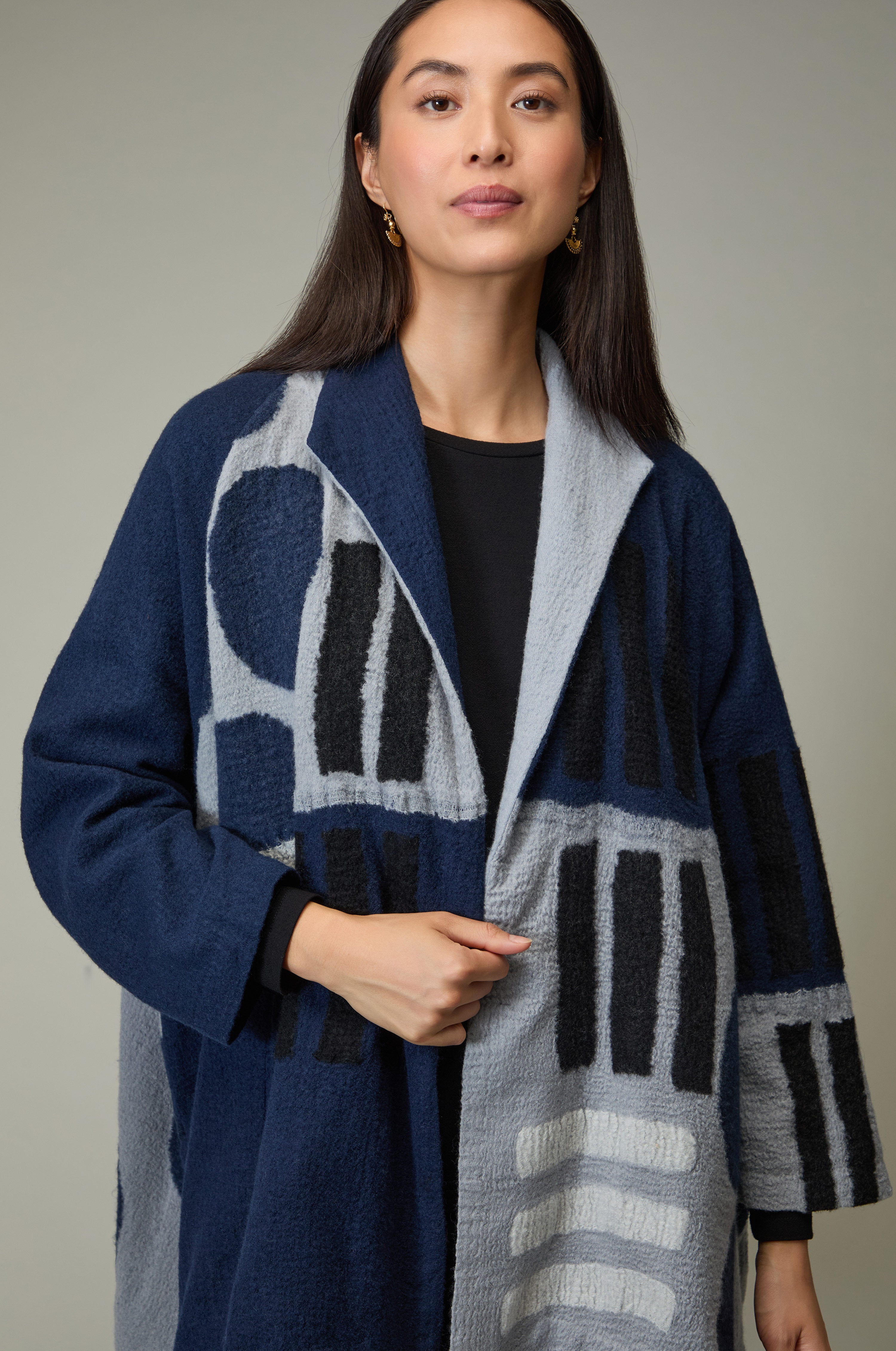 Crafted by Raga, a brand known for bold artistic expression and textile-led storytelling, this striking jacket brings together abstract form and tactile depth. Made from a richly textured felted wool, it showcases an interplay of oversized spots, mini checks and graphic dashes in tonal shades of navy, grey, and black. The softly cocooned silhouette drapes with ease, while the open front and deep side splits allow for fluid, effortless layering, discreetly finished with concealed pockets for additional practicality.