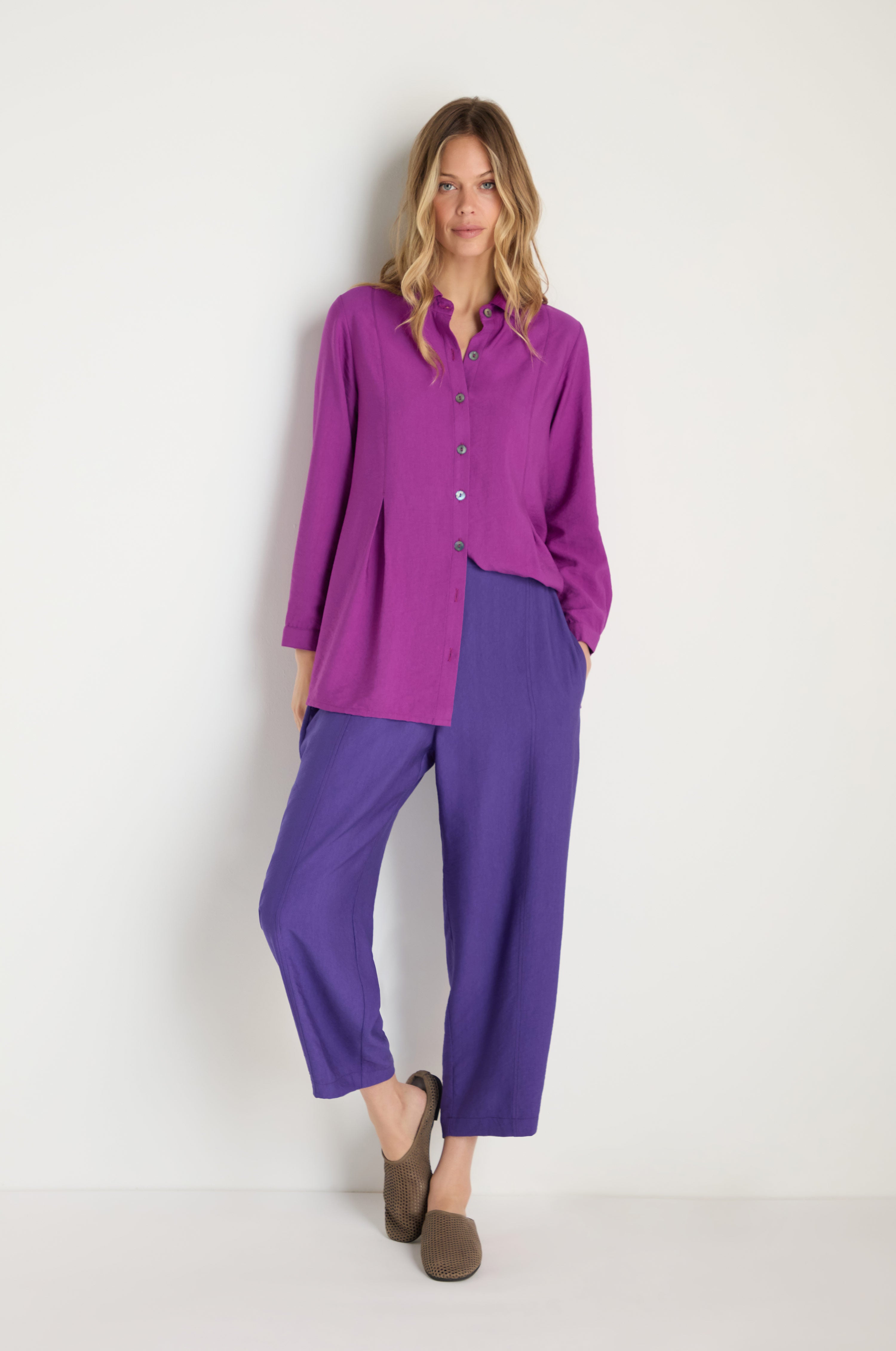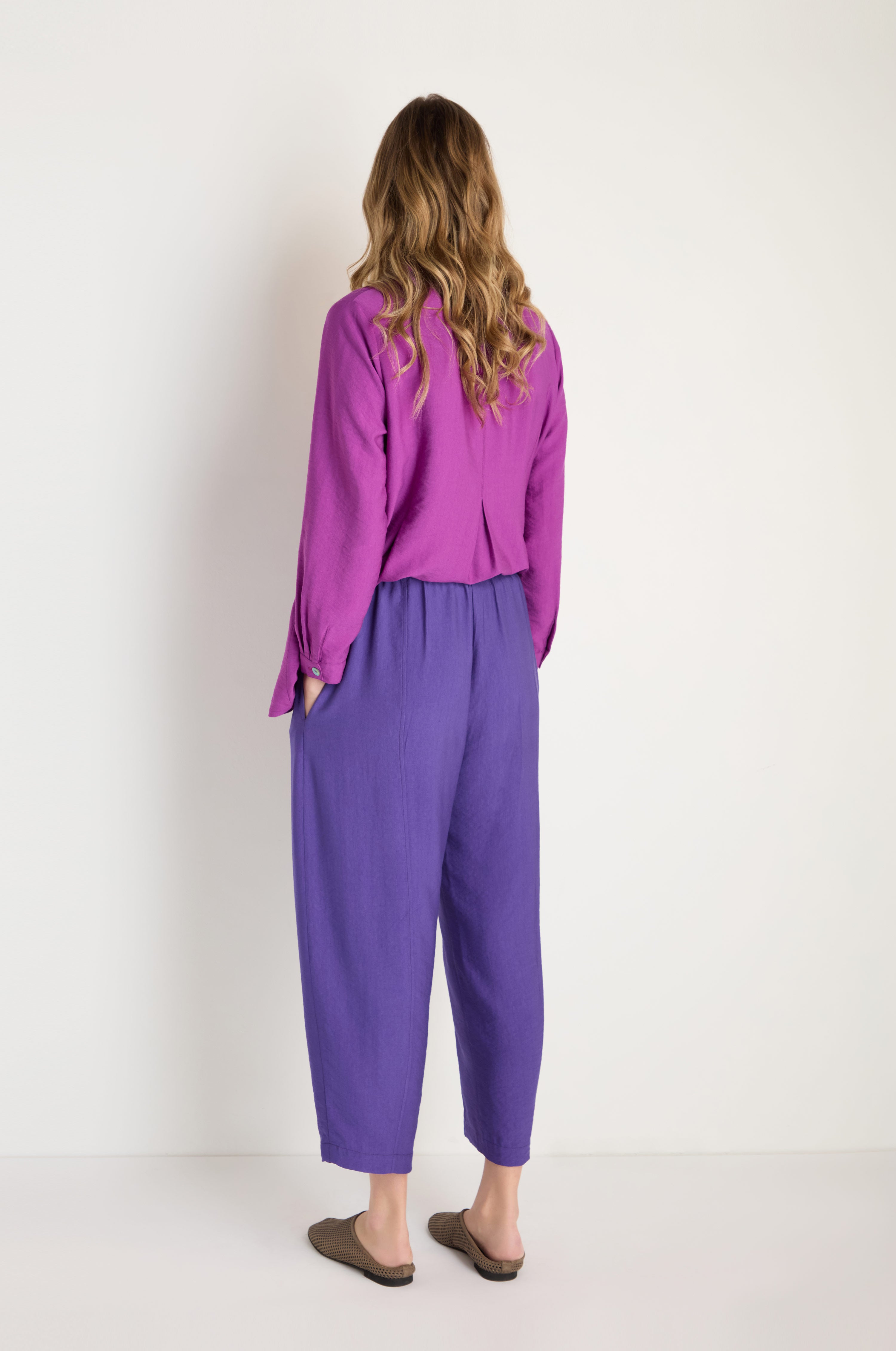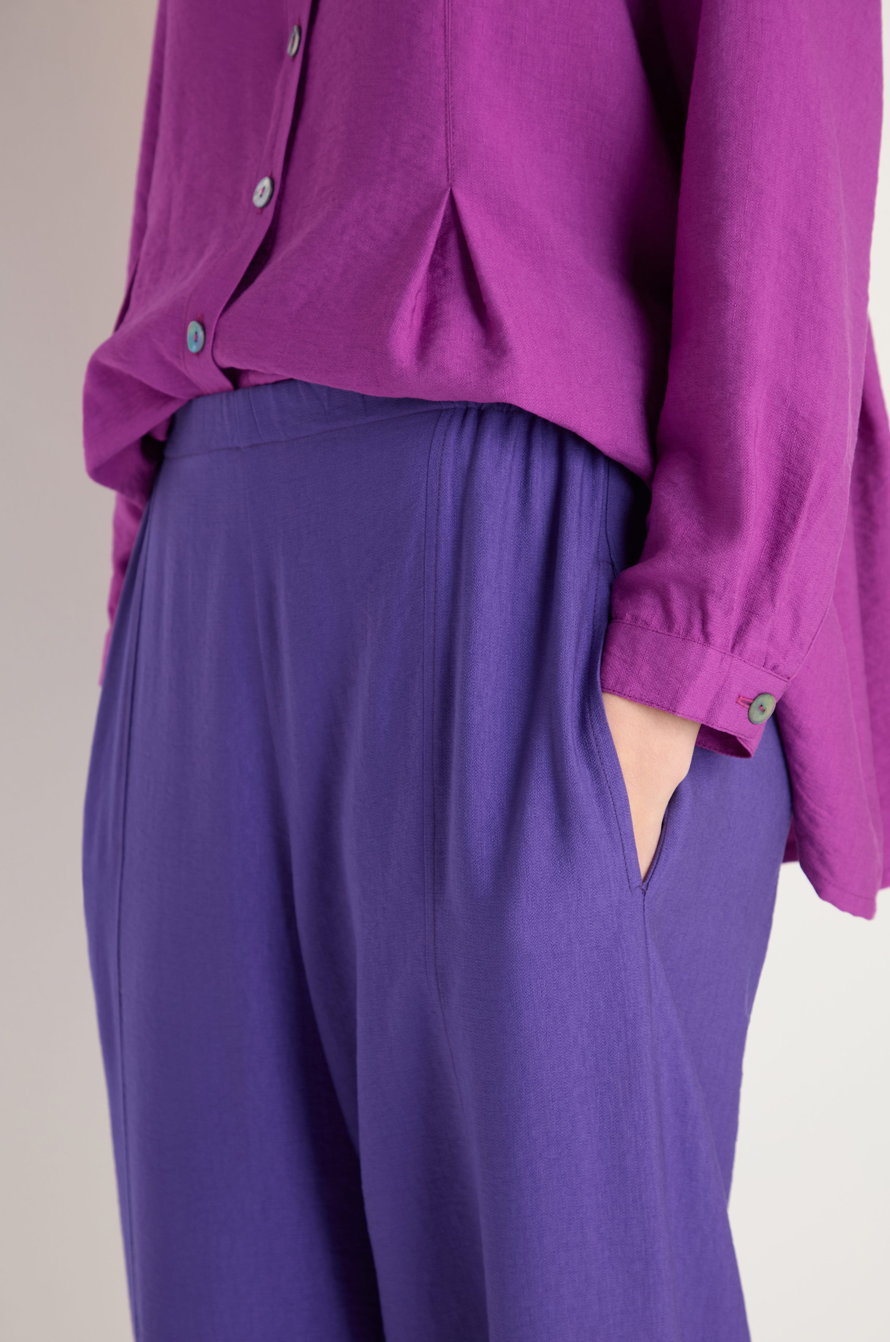 The Textured Viscose Bubble trouser offers effortless style and all-day comfort. Crafted in a rich purple, front and back seams create a flattering bubble leg with a subtly cropped, ankle-grazing length. The luxuriously soft fabric drapes beautifully while the subtle texture adds sophisticated depth and character. Perfect for both casual and polished looks.