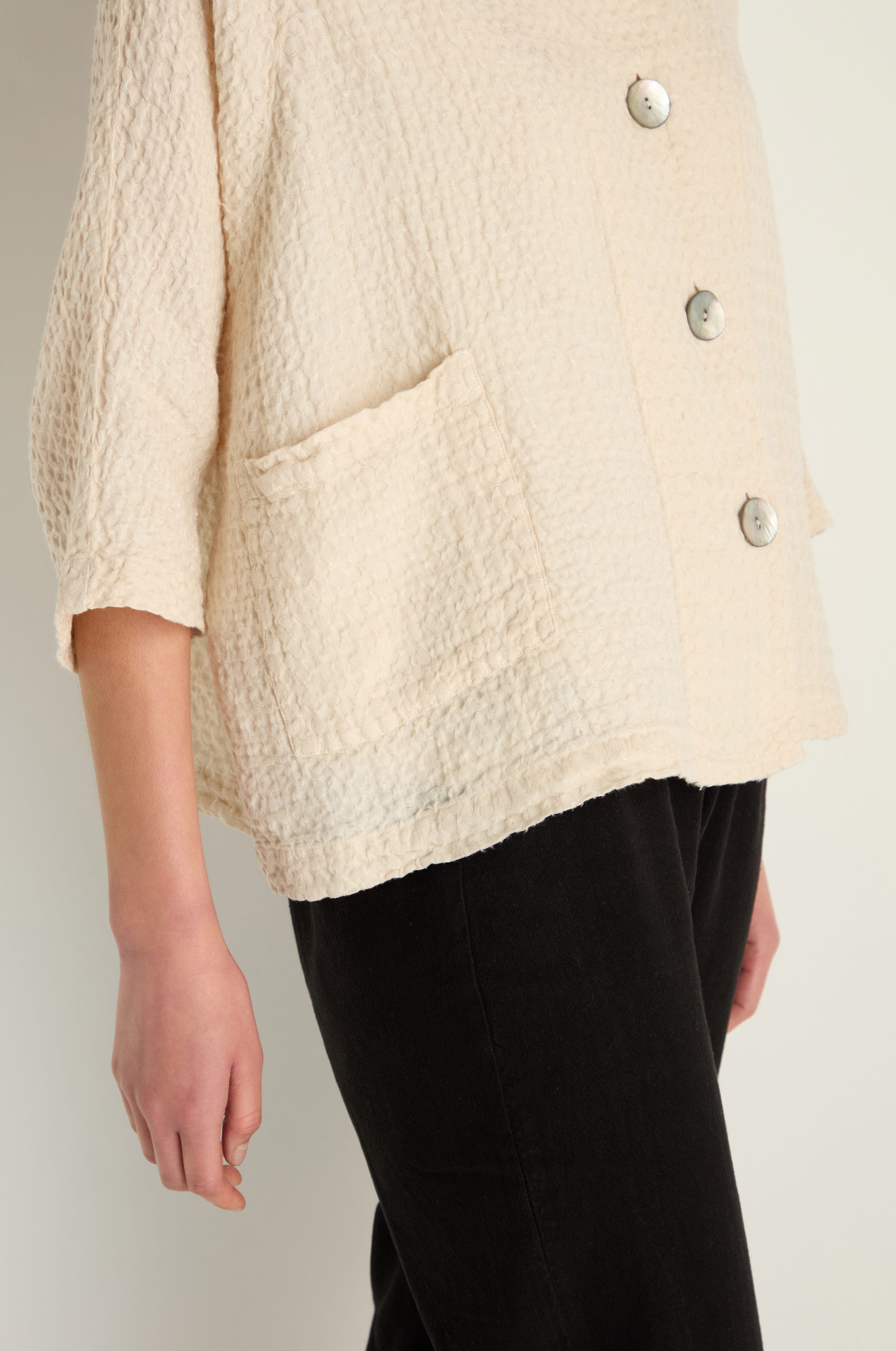 The Sahara Waffle Linen Boxy Jacket is cut from linen with a deeply textured waffle finish, giving it structure, softness, and a distinctive touchable surface. Designed with an oversized boxy shape, it layers easily while retaining a relaxed, draped feel.