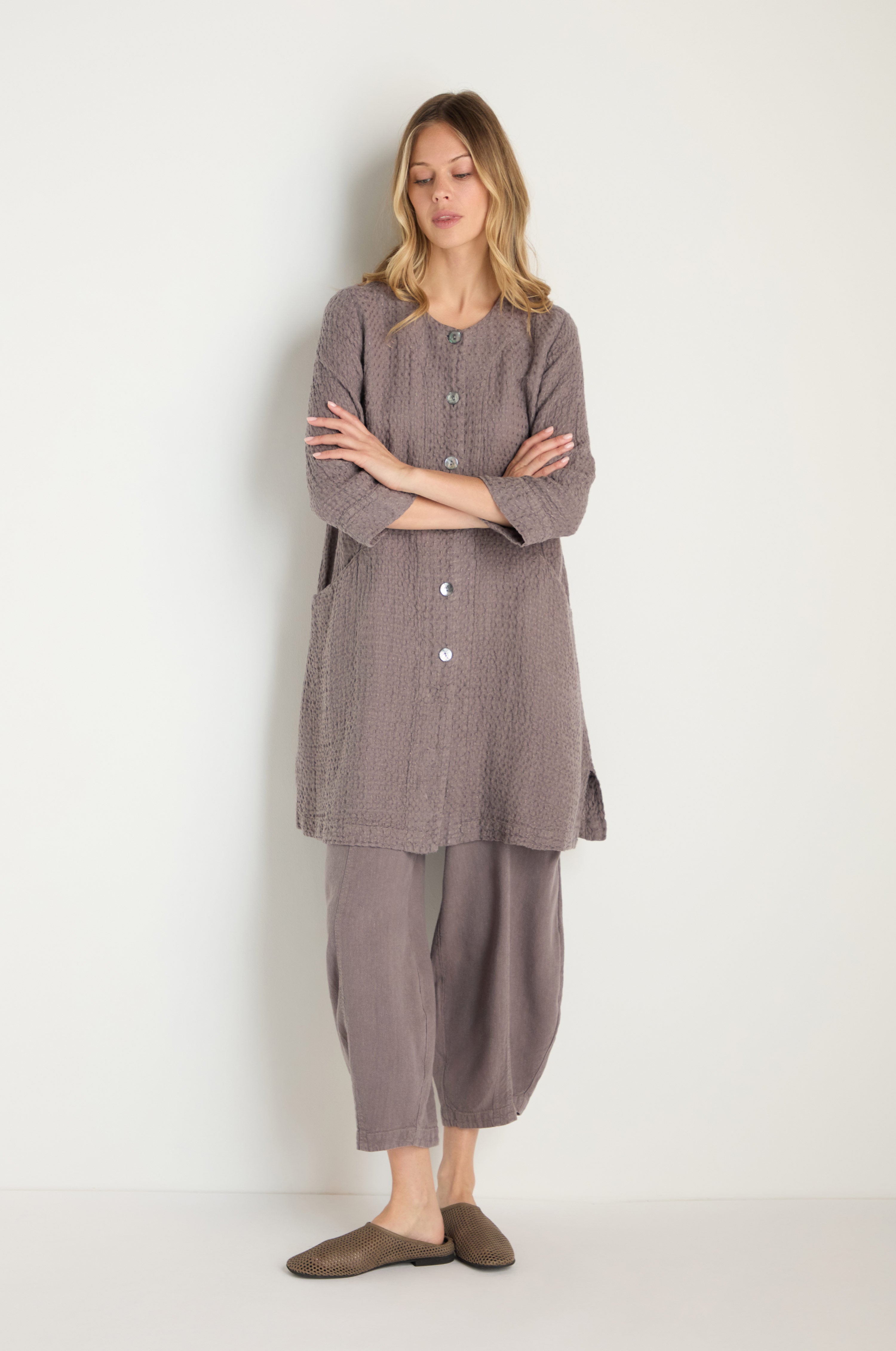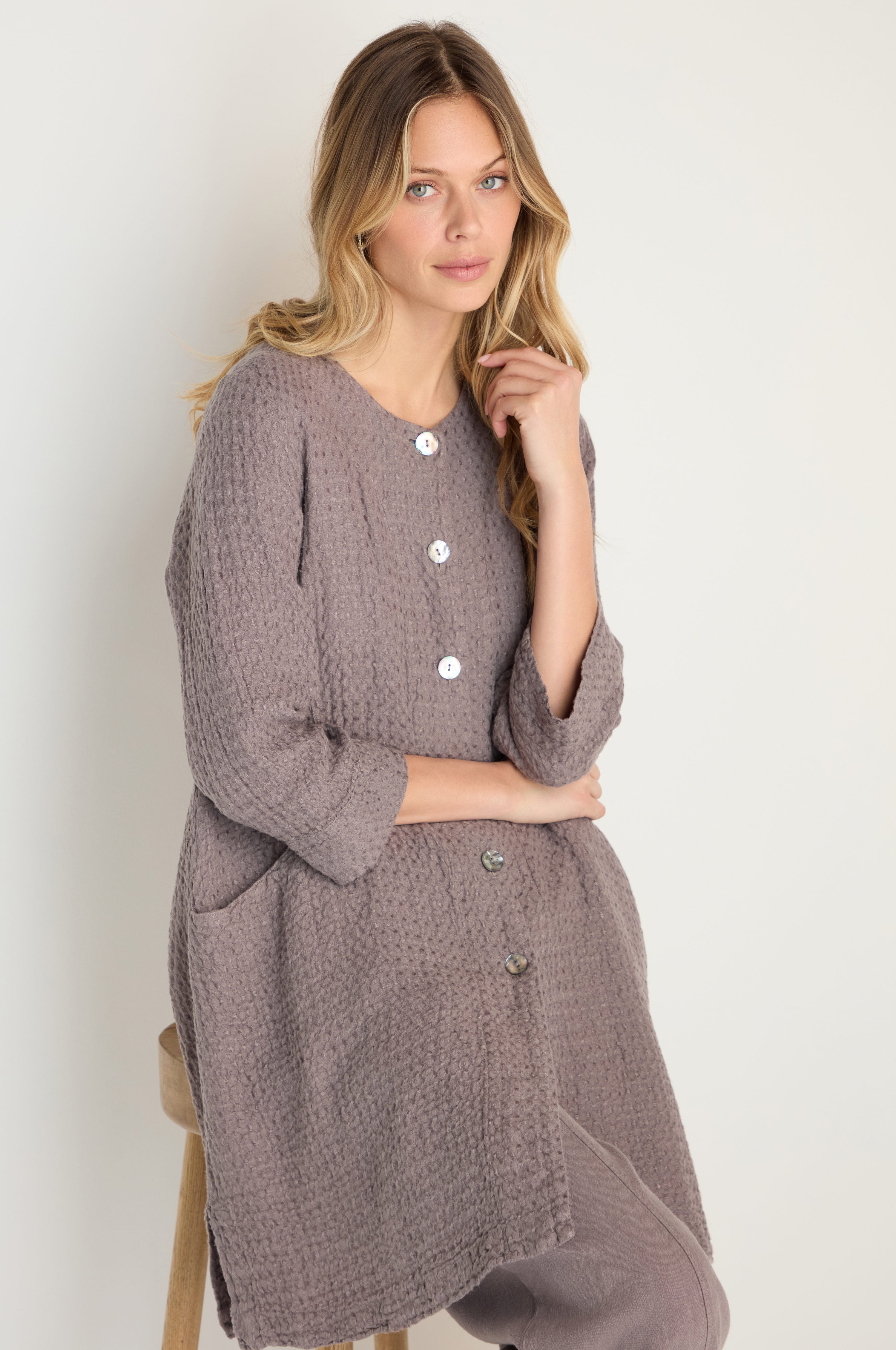A versatile wardrobe essential, the Sahara Waffle Linen Long Jacket transitions effortlessly from a soft spring layer to a sleek long tunic. Crafted from 100% breathable linen, it features 3/4 length sleeves and a relaxed silhouette, allowing it to be worn open for airy layering or buttoned up for a refined, elongated look.
